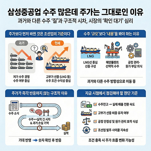 조선업 관련 뉴스가 나올 때마다 반복되는 반응이 있습니다. 수주 소식이 전해져도 주가는 크게 움직이지 않고, 일정 시간이 지나면 다시 관심에서 멀어지는 흐름입니다. 삼성중공업 역시 오랜 기간 이런 시선 속에 놓여 있었습니다. 다만 최근 흐름을 놓고 보면, 과거와 동일한 기준으로만 주가를 해석하기에는 판단 요소 자체가 달라진 구간에 들어와 있다고 볼 수 있습니다. 지금의 핵심은 단기 주가 … Read more