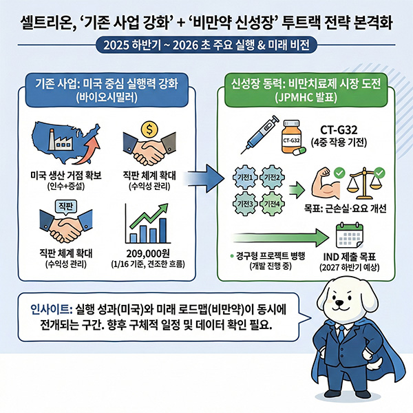 2025년 하반기부터 2026년 초까지 셀트리온은 미국 생산 거점 확보와 직판 구조 강화라는 실행 중심 과제를 연속적으로 진행해 왔습니다. 이와 동시에 JPMHC를 통해 비만치료제 CT-G32와 경구형 프로젝트를 언급하며, 중장기 신약 파이프라인 방향성도 함께 제시했습니다.